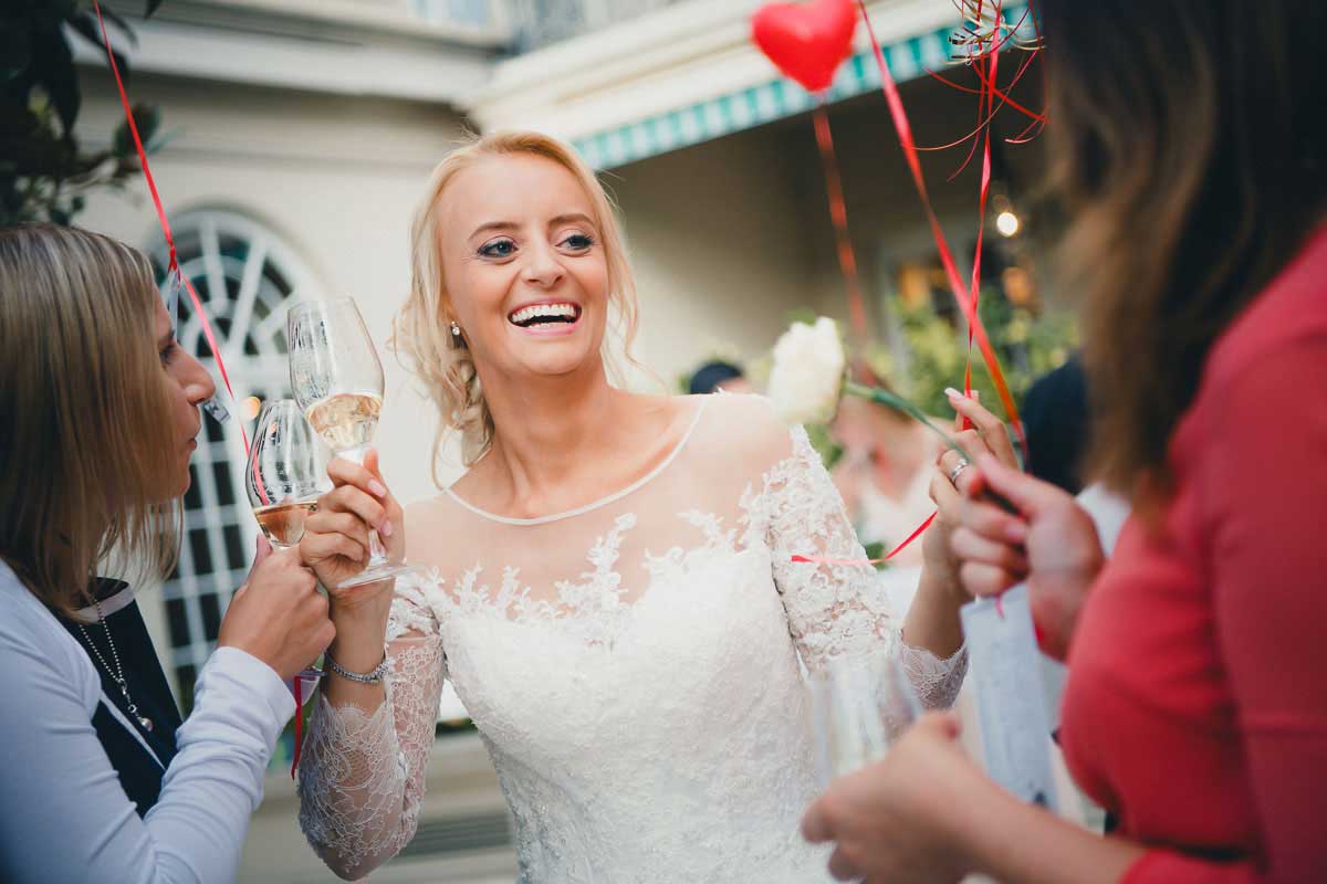 Direkt nach der Zeremonie treffen sich alle zum Sektempfang. Auf der Terrasse oder im Garten kommt eine lockere, fröhliche Stimmung auf. Dann nehme ich mir Zeit nur für euch als Paar. Für das Porträt-Shooting nutzen wir das weiche Licht der Parkanlage.