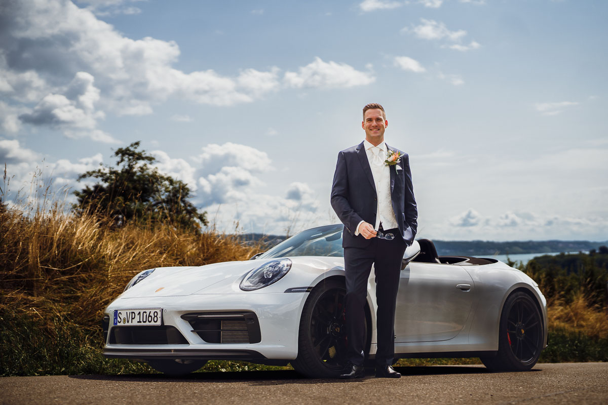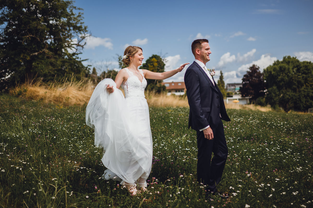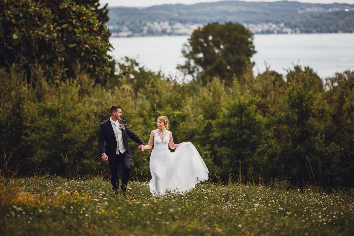 Der Tag begann im Hotel Ko Ono in Konstanz-Litzelstetten, ganz in der Nähe der Zufahrt zur Insel Mainau. Dort traf ich zunächst die Braut, die gerade die letzten Handgriffe ihres Stylings erhielt. Danach ging es direkt zum Bräutigam, der bereits gespannt auf einer malerischen Wiese in der Nähe des Hotels auf den “First Look” wartete. Der Ausblick auf den Bodensee und die Insel Mainau im Hintergrund machte diesen Moment besonders magisch. Nach dem First Look hatten wir noch etwas Zeit für ein kleines Brautpaarshooting, bevor es für die Trauung auf die Insel Mainau ging.