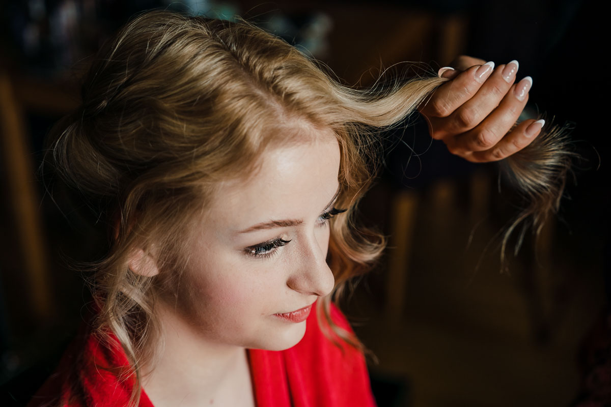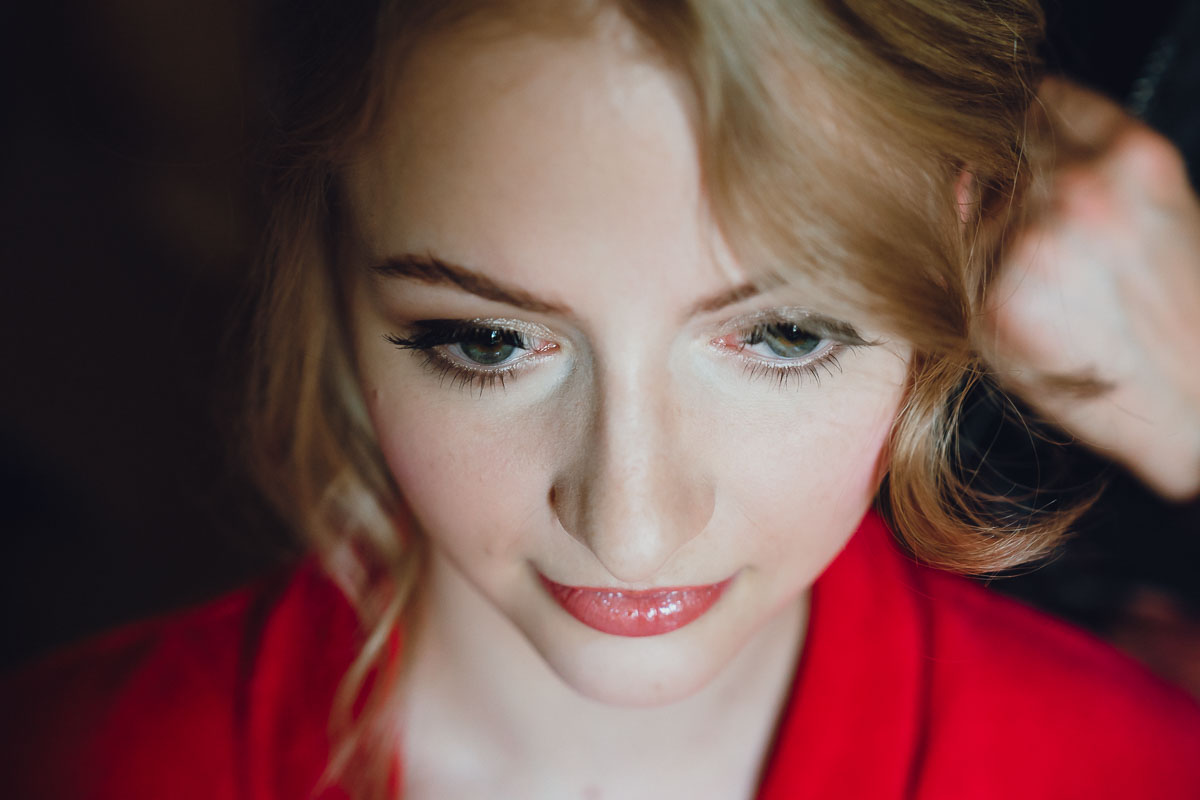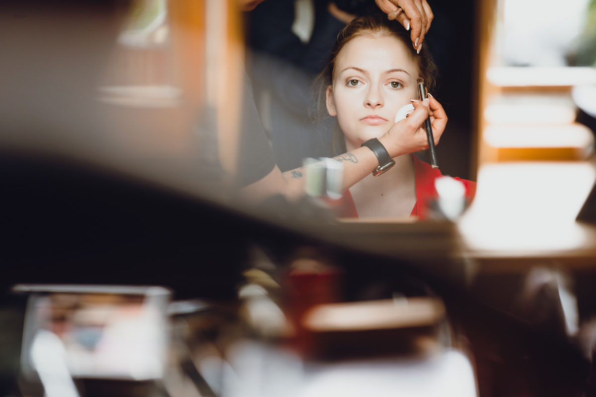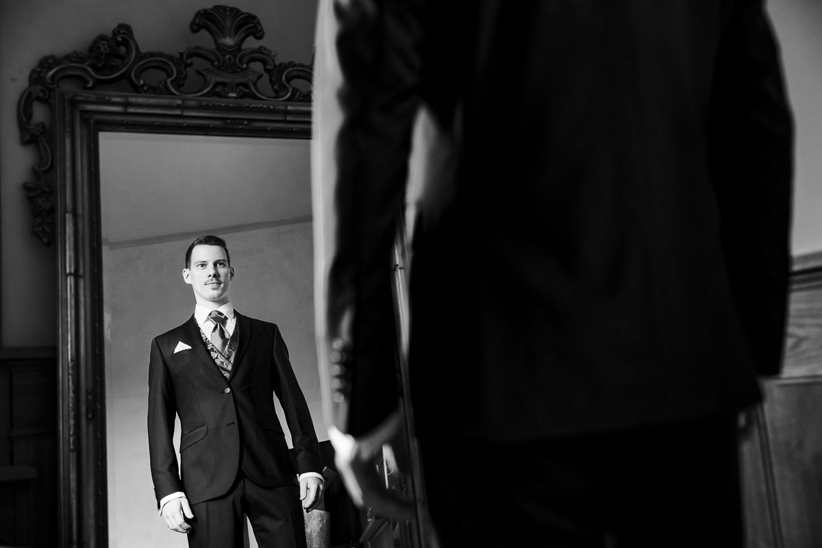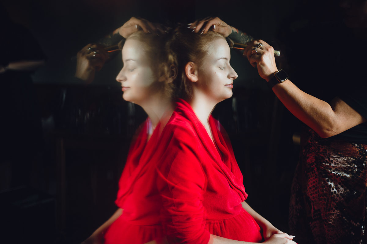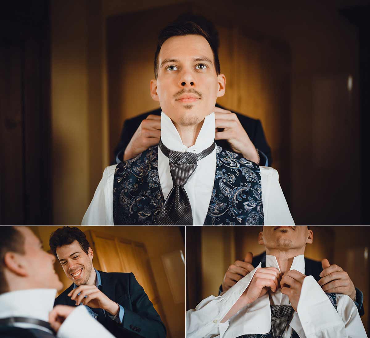 Der Tag begann mit den Vorbereitungen im Schloss. Ich hatte das Privileg, den Bräutigam beim Ankleiden zu fotografieren , bevor wir zum Brautstyling übergingen. Die Lichtverhältnisse während des Stylings waren fast optimal, was mir ermöglichte, mit verschiedenen Effekten zu spielen und ein paar dramatische Momente einzufangen.