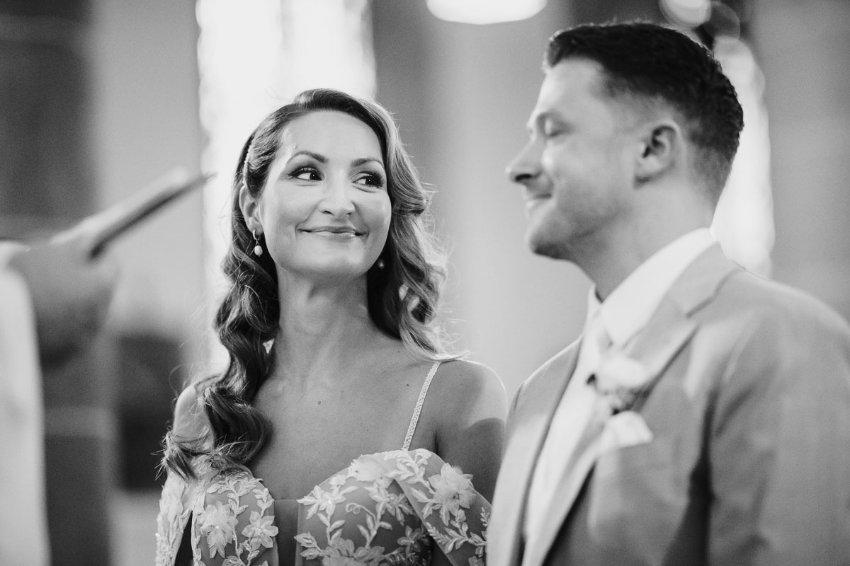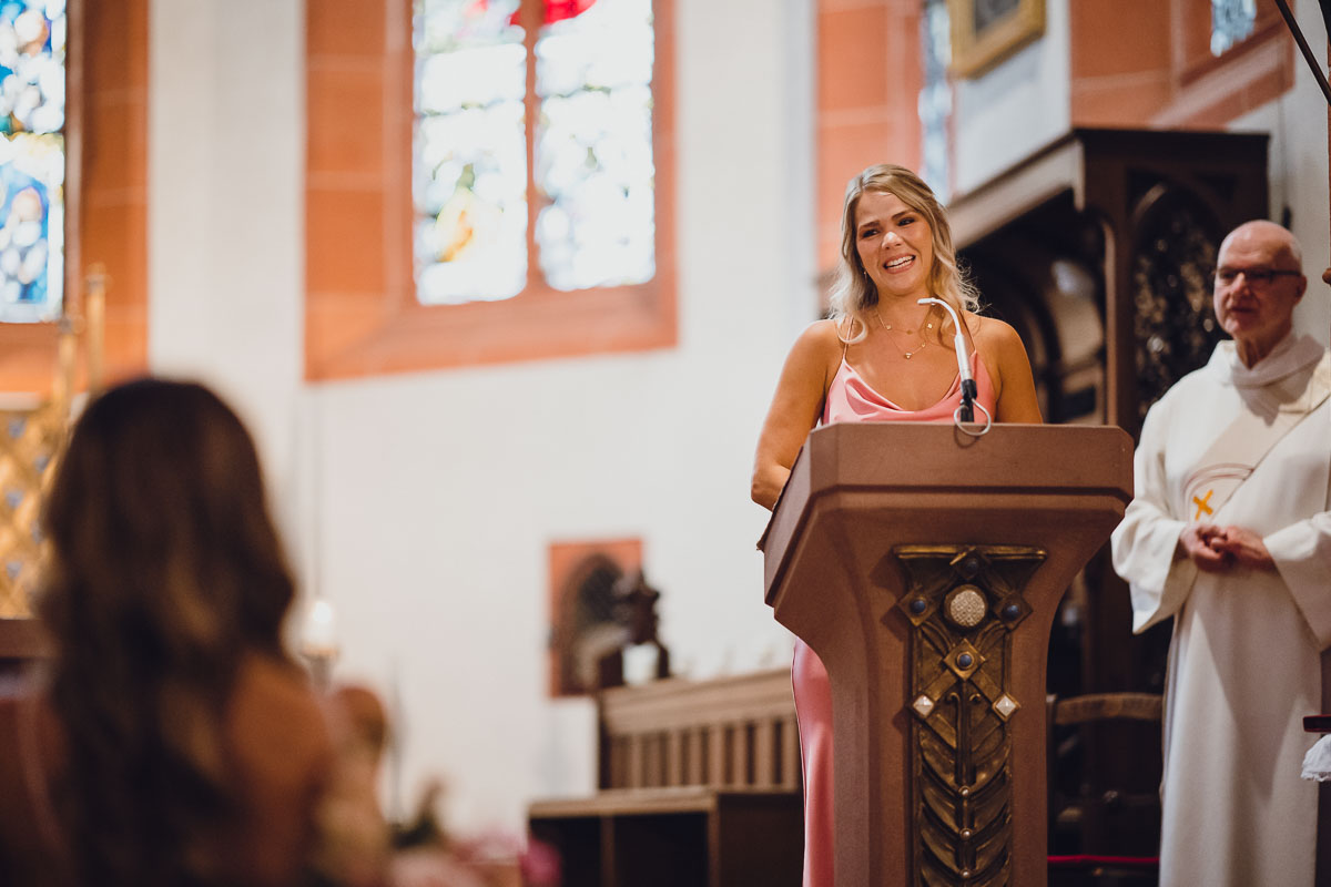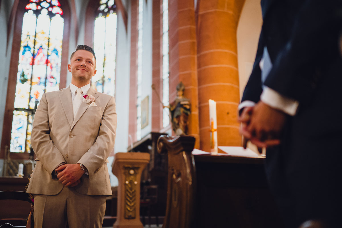 Nach den Vorbereitungen ging es in die Pfarrkirche St. Ulrich in Deidesheim, wo die Trauung stattfand. Die Trauzeugen trugen das Ehegelübde des Paares vor und sorgten damit für emotionale Gänsehautmomente bei den Anwesenden. Nach der Zeremonie nutzten wir die Gelegenheit für einige schnelle Hochzeitsfotos in den malerischen Weinbergen, bevor es zu den Gratulationen ins Weingut von Winning ging.