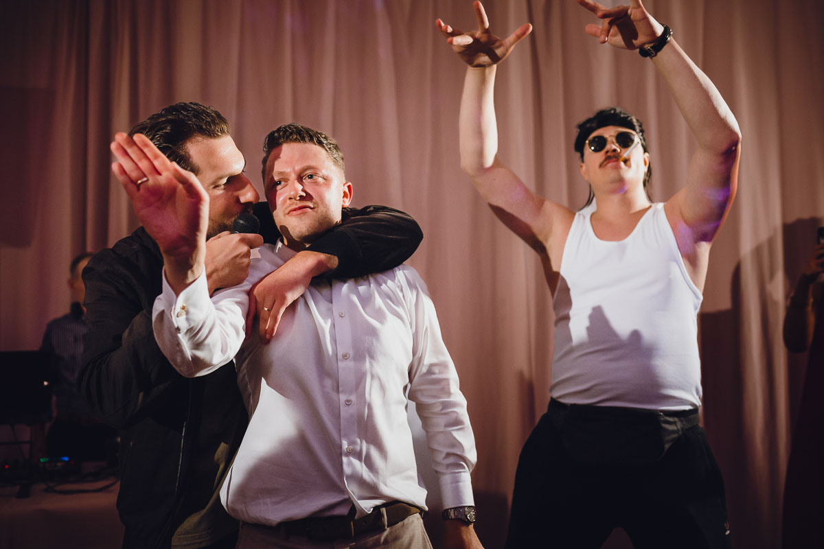 Am Nachmittag konnten die Gäste bei Kaffee und Kuchen das wunderschöne Ambiente des Innenhofs genießen. Am Abend nahm die Feier früh an Fahrt auf. Nachdem die ersten Reden gehalten waren, tanzten bereits die meisten Gäste im Festsaal — ein klares Zeichen dafür, dass die Party legendär werden würde. Und genau das war sie: Fröhlich und ausgelassen wurde im Partykeller des Weinguts von Winning bis in die Nacht gefeiert.
