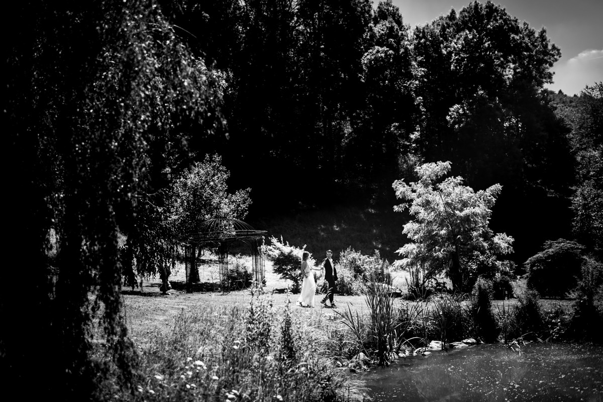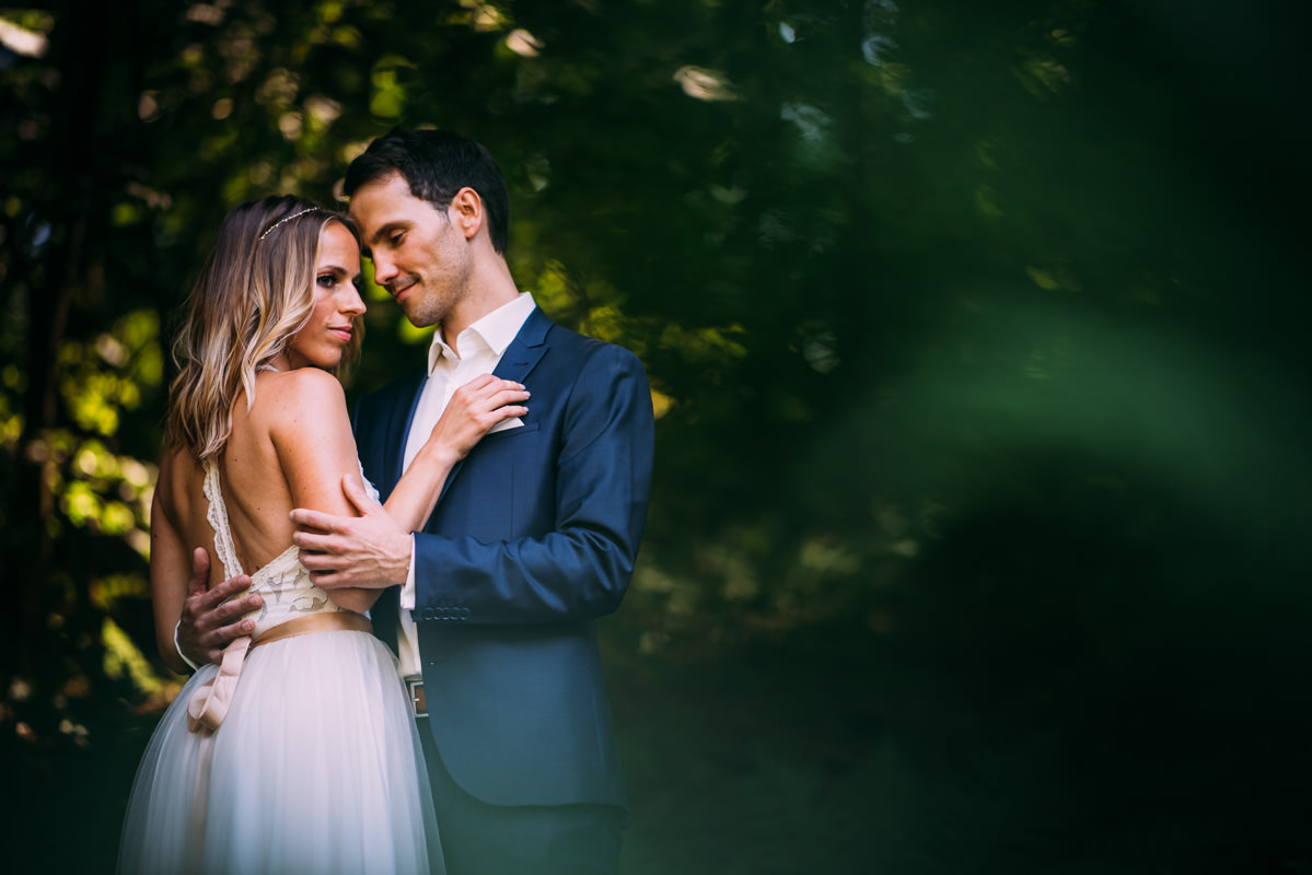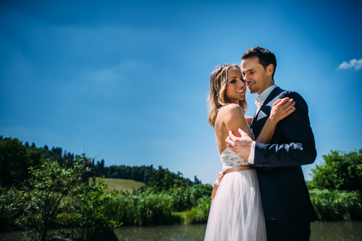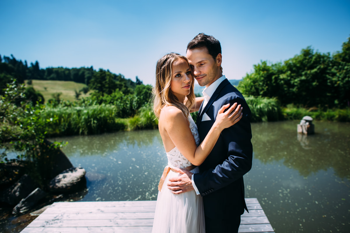 Es gibt einen kleinen Teich mit einem Steg- Und genau dort fand die standesamtliche Trauung der beiden statt. Das Brautpaar hatte sich genau diesen Ort für ihre Trauung ausgesucht, eben weil es so schön dort ist. Vor der eigentlichen Trauung haben wir uns im Hofgut getroffen, um dort ein paar schöne Hochzeitsbilder zu machen. Es schien die Sonne und zwar ganz schön heftig, was für Portraitaufnahmen um die Mittagszeit nicht unbedingt vorteilhaft ist. Wir Fotografen sprechen da von hartem Licht, und eigentlich mag man lieber weiches Licht, da dies für Portraits schmeichelhafter ist. Mehr darüber findet ihr z.b. in meinem Artikel über Hochzeitsfotos und die beste Zeit für Portraits. Dennoch haben wir genügend schöne Stellen gefunden, wo ich mit dem vorhandenen harten Licht gut spielen konnte.