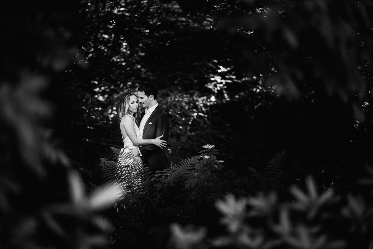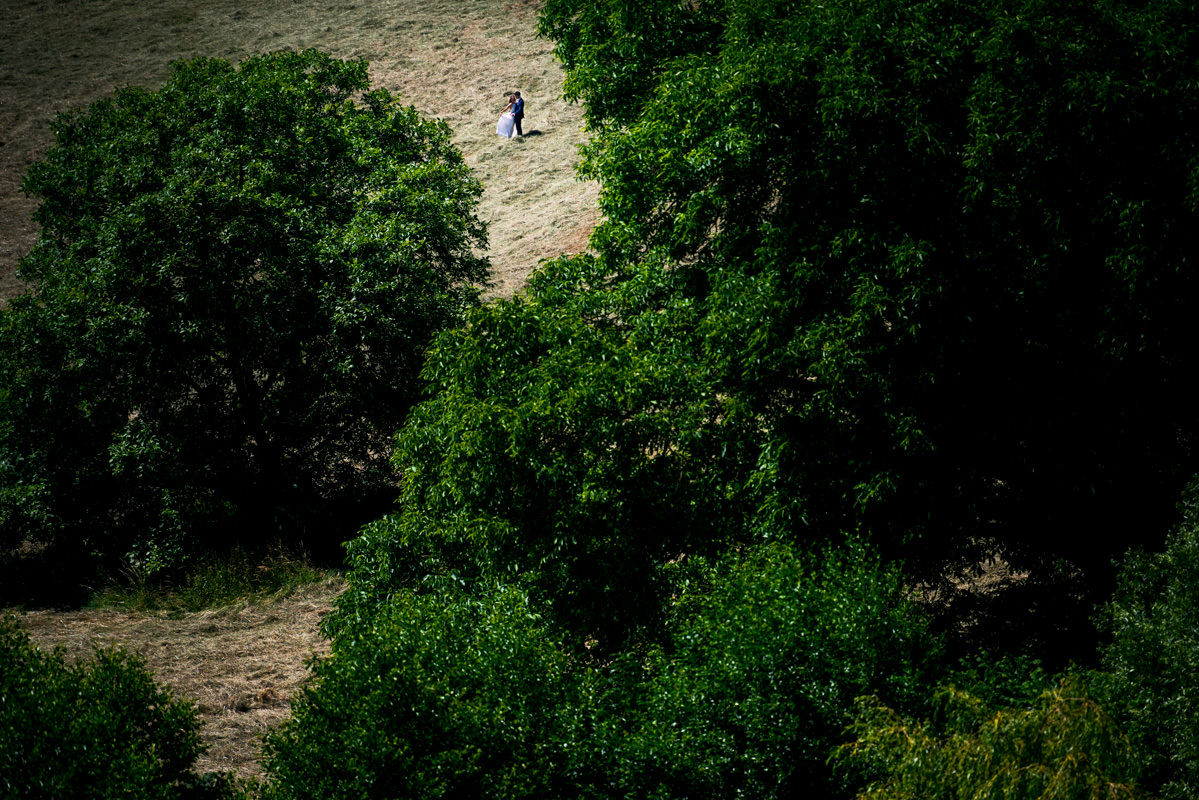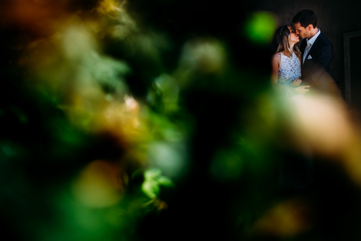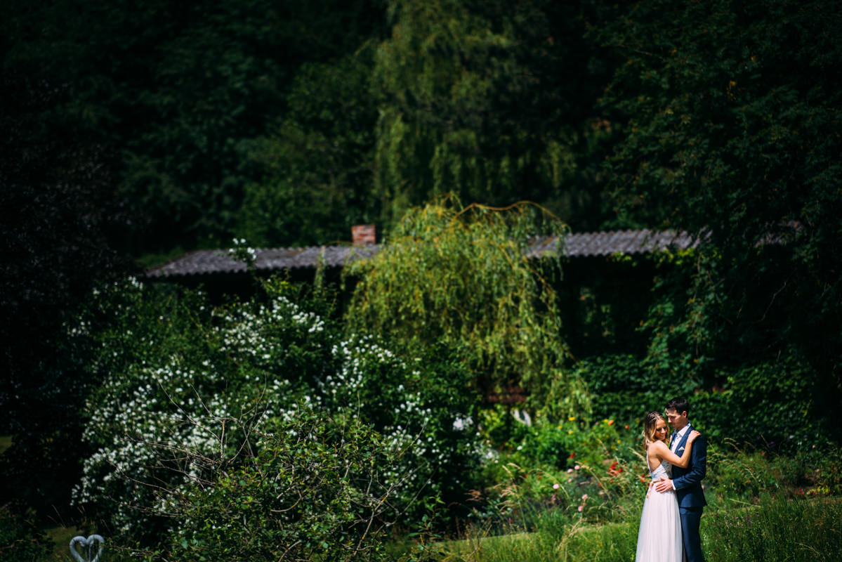Es gibt einen kleinen Teich mit einem Steg- Und genau dort fand die standesamtliche Trauung der beiden statt. Das Brautpaar hatte sich genau diesen Ort für ihre Trauung ausgesucht, eben weil es so schön dort ist. Vor der eigentlichen Trauung haben wir uns im Hofgut getroffen, um dort ein paar schöne Hochzeitsbilder zu machen. Es schien die Sonne und zwar ganz schön heftig, was für Portraitaufnahmen um die Mittagszeit nicht unbedingt vorteilhaft ist. Wir Fotografen sprechen da von hartem Licht, und eigentlich mag man lieber weiches Licht, da dies für Portraits schmeichelhafter ist. Mehr darüber findet ihr z.b. in meinem Artikel über Hochzeitsfotos und die beste Zeit für Portraits. Dennoch haben wir genügend schöne Stellen gefunden, wo ich mit dem vorhandenen harten Licht gut spielen konnte.