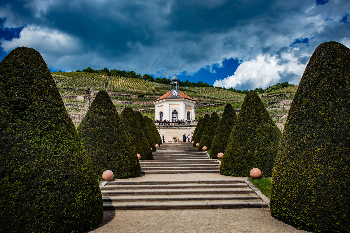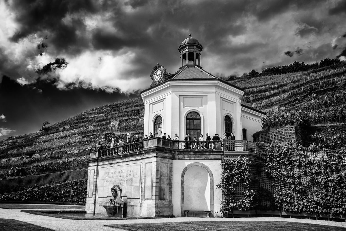 Ein besonderes Highlight bei einer Hochzeit im Schloss Wackerbarth ist eine Trauung im Belvedere. Das Belvedere ist ein kleines Barockes Bauwerk das sich auf dem Wackerbarthberg befindet. Von hier überblickt man das ganze Areal des Schlossgeländes.