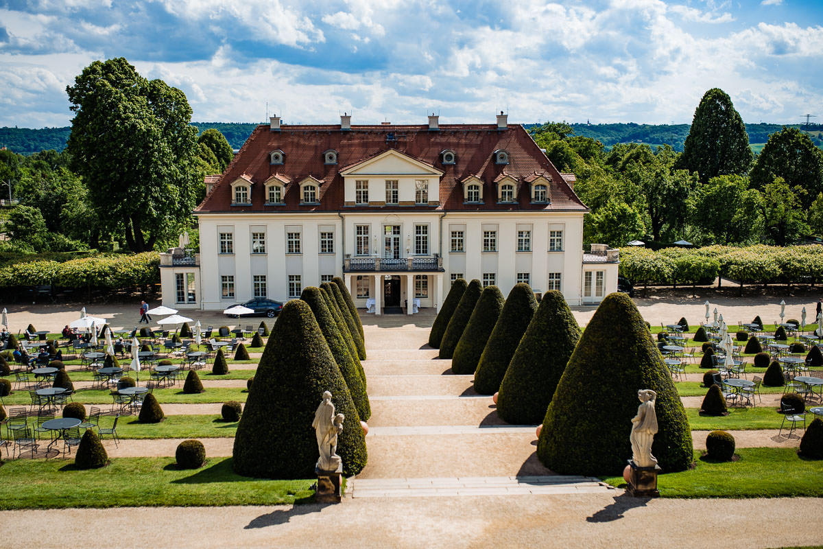 Die Hochzeitslocation Schloss Wackerbarth befindet sich in Radebeul bei Dresden. Es ist sowohl ein Schloss als auch ein Weingut. Aber vorallem ist es ein großartiger Ort zum heiraten und zum feiern. Mit leckerem Essen und erlesenen Weinen verwöhnt euch das Team des Schlosses. Eine Trauung im Belvedere mit Blick auf das Schloss sind nur eines der Highlights bei einer Hochzeit im Schloss Wackerbarth.