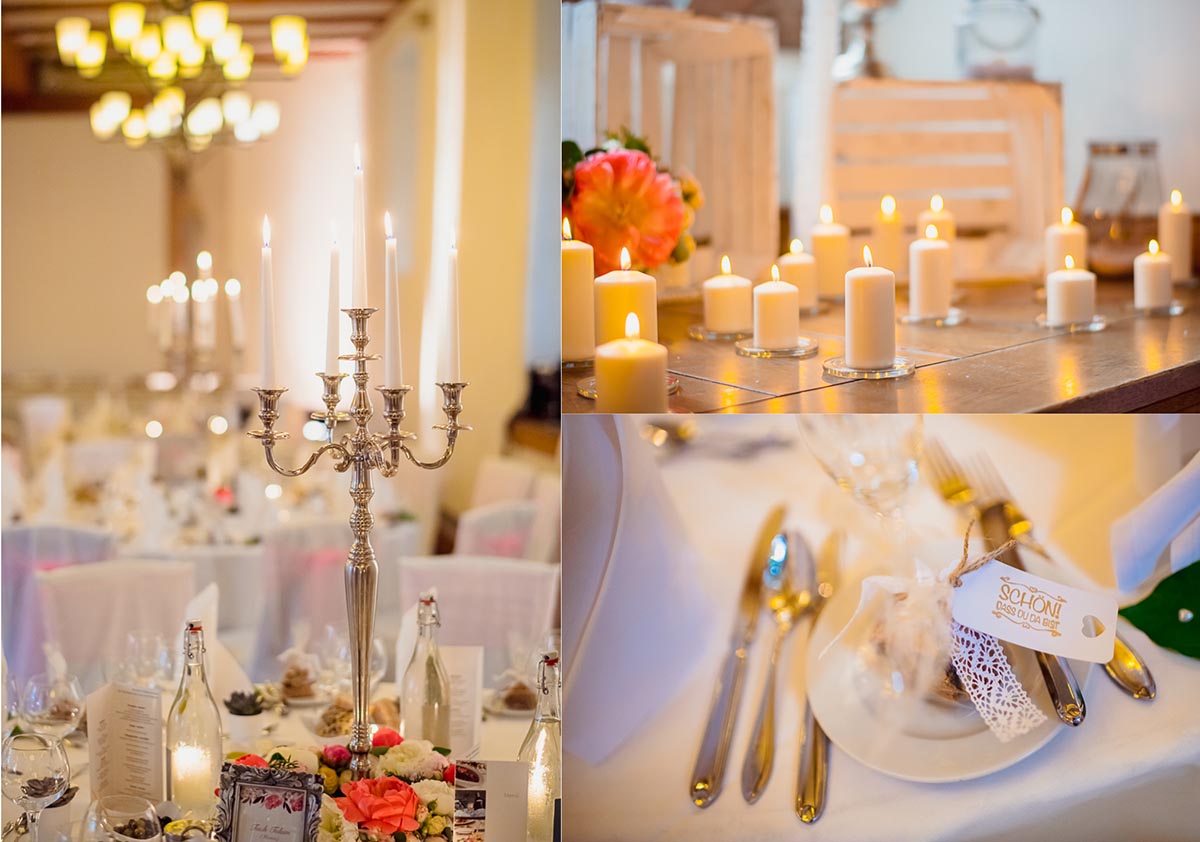 Größere Hochzeitsgesellschaften feiern im Rittersaal mit bis zu 110 Personen. Für die Party steht dann der Gewölbekeller zur Verfügung. Der Sektempfang wird im Garten am Schlossteich veranstaltet. Kleinere Gesellschaften feiern im Renaissancezimmer mit bis zu 40 Personen, oder im Restaurant Mathilde mit Havannabar mit bis zu 70 Gästen.