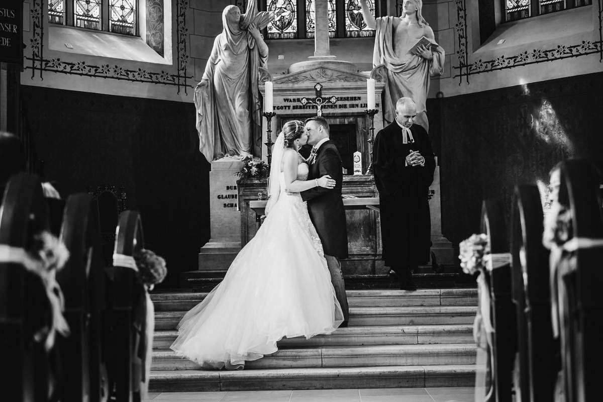Die kirchliche Trauung fand in Eltville in der Johanneskirche statt. Eine sehr schöne aber auch grosse Kirche. Die Besonderheit in der Kirche ist, dass das Brautpaar nicht mit dem Rücken zu den Gästen sitzt, sondern den Besuchern zugewandt. Was natürlich für viele der Gäste schöner ist. Nach der Kirche ging es aber nahtlos wieder zurück nach Wiesbaden in die Villa im Tal. Falls ihr noch weitere Infos zum Thema heiraten in Eltville sucht, dann habe ich einen ausführlichen Artikel geschrieben.