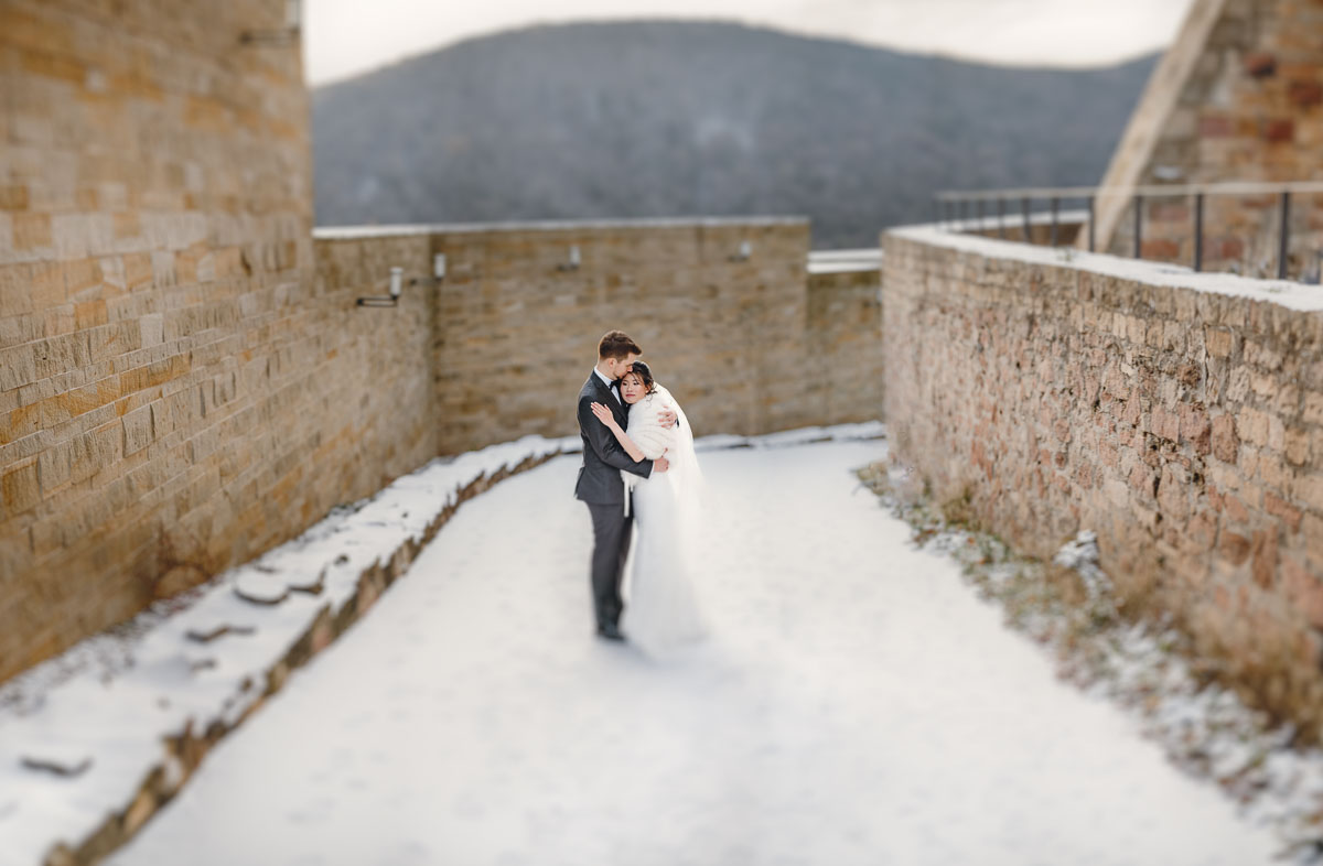 Selbst ein bewölkter Himmel kann für eine besondere Atmosphäre in euren Hochzeitsfotos sorgen. Wenn ihr in einer Region lebt, in der Schnee eher selten ist, könnt ihr eure Hochzeitslocation bewusst so wählen, dass ihr eine winterliche Kulisse mit Bergen oder einem romantischen Schloss habt. Denn gerade Schlosshochzeiten sind im Winter besonders beliebt.